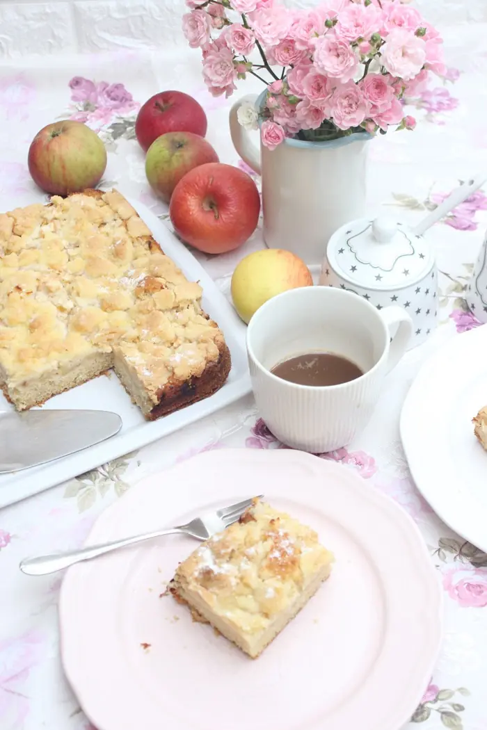 Als ich vor ein paar Tagen ans Telefon ging, hörte ich meine beste Freundin: „Vera, wann hast du Zeit für mich? Ich habe dir etwas sehr Wichtiges zu sagen! Ich bin in ein paar Stunden da. Und bitte mach eins deiner süßen Desserts, damit wir beim Reden etwas Süßes essen können. “Und – klick, aufgelegt!“. Da stand ich nun und fragte mich, was mache ich nur. Ich wusste ja, sie isst super gerne Äpfel. Nach „einfachen“ 10 Minuten war die Entscheidung gefallen – einen schnellen Apfelkuchen mit Streuseln!