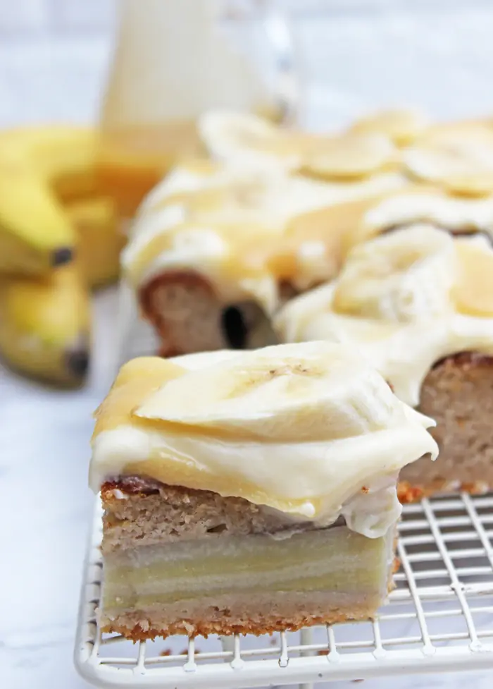 Wenn Ihr diesen Bananenkuchen mit Karamell-Frischkäse Creme machen, müsst Ihr keine Angst haben, dass der Kuchen auseinanderfällt, wenn Ihr mit einer Gabel hineinstecht. Der Kuchen hat eine sehr weiche, aber dichte Krume. Ich habe meinen Bananenkuchen mit halbierten Bananenscheiben belegt, aber dies ist optional, obwohl es sehr zu empfehlen ist. Aber fügt geschnittene Bananen hinzu, nur für den Fall, dass Ihr keine Reste einfrieren und planen, den Kuchen innerhalb von zwei Tagen fertigzustellen.