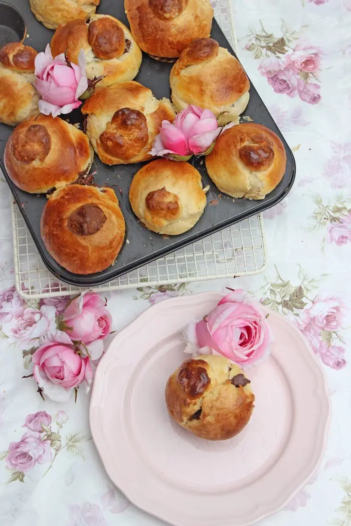Alle Zutaten – mit Ausnahme der Schokolade – kommen gleichzeitig in die Rührschüssel. Der Teig wird sorgfältig geknetet, bis er geschmeidig und elastisch ist. Danach lässt du ihn zugedeckt für eine Stunde an einem warmen Ort aufgehen. Sobald der Teig seine Größe verdoppelt hat, formst du kleine Portionen, füllst sie mit flüssiger Schokolade und schließt sie wieder zu kleinen Brioches.