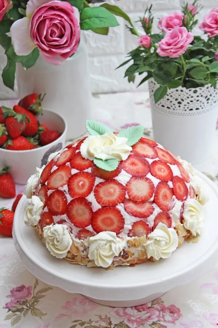 Die halbkreisförmige Kuppel, ausgekleidet mit Erdbeerscheiben, wirkt wie eine fruchtige Glaskuppel. Gekrönt wird die Torte mit gerösteten Mandelblättchen und hübschen Sahnerosen – ideal für Feste oder als besonderes Mitbringsel.