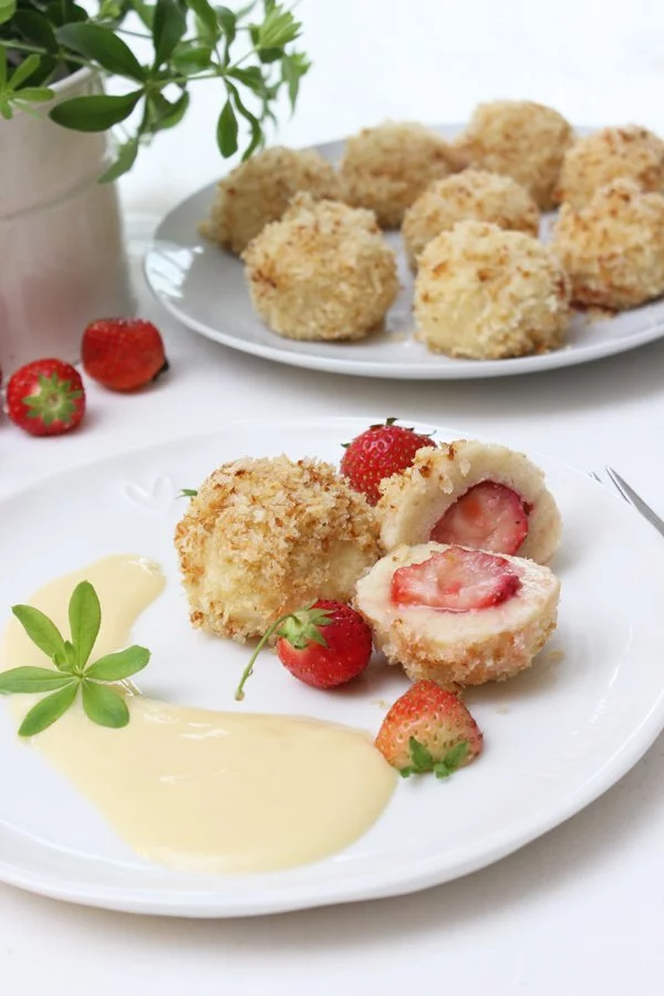 Erdbeer-Topfenknödel mit Waldmeistersoße – das perfekte Dessert im Frühling