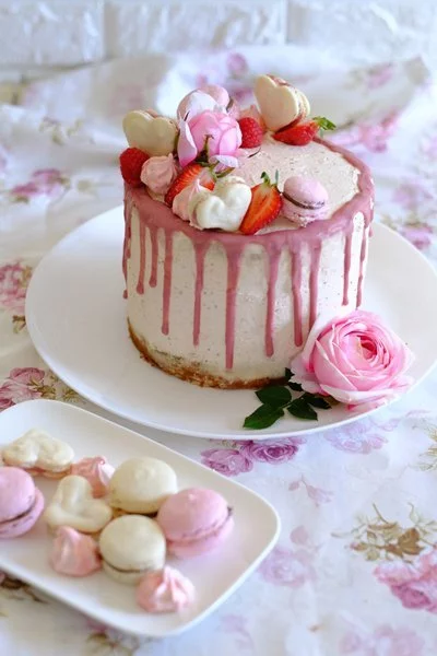 Himmlische Erdbeer-Zitronen-Drip Cake mit Macarons: 3 wunderbare Genuss Schichten