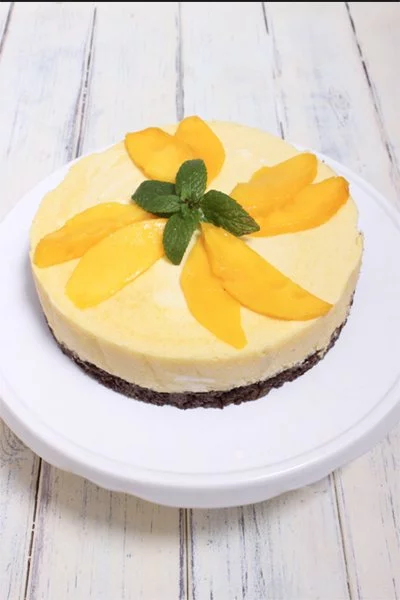 - Torte auslösen, Oberfläche und Rand mit den Mangoscheiben dekorieren. Bis zum Servieren in den Kühlschrank stellen oder, wie ich gleich auf den Tisch stellen.