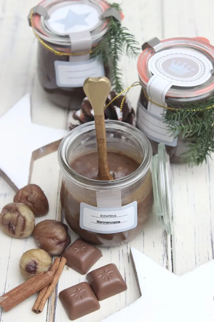Mit dieser feinen Maronencreme mit Nougat, könnt ihr Euch die beliebten Maronen direkt auf Euer Brot streichen. Süß, cremig … Kinder und Erwachsene genießen diesen köstlichen Aufstrich auf Brot,Toastbrot, Waffeln oder Crêpes. Es ist auch köstlich in Joghurt eingerührt, mit Bananen oder Birnen ist der Aufstrich auch sehr lecker. Es ist der Hauptbestandteil einiger eleganter fanatischer Dessert wie Schokoladen- und Maronenfondant oder Maronenmousse. Der Brotaufstrich ist auch ein schönes und tolles Weihnachtsgeschenk aus der Küche, wenn ihr noch ein Last-Minute Geschenk benötigt.