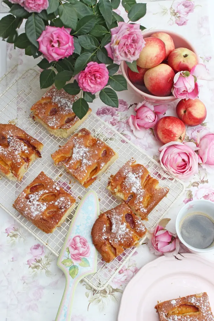 - Den Nektarinenkuchen vor dem Servieren mit Puderzucker bestäuben.
