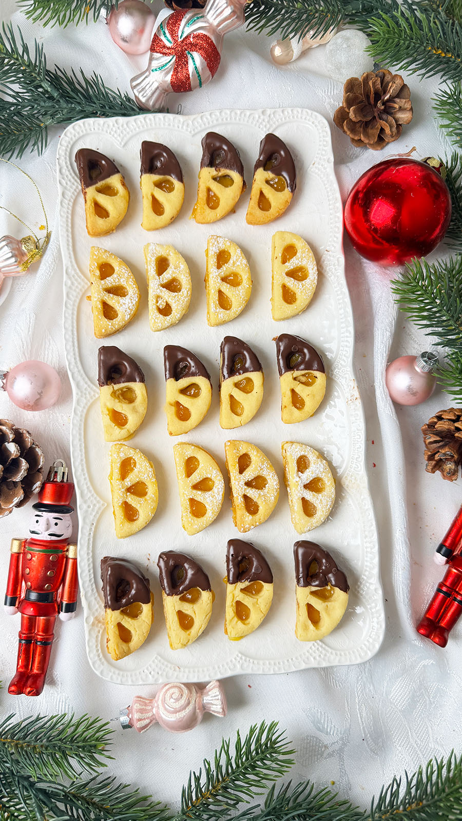 Diese kleinen Orangenplätzchen in Orangenspalten Form gehören für mich zu den schönsten Wintermomenten: zarter Mürbeteig, fruchtiges Orangencurd und je nach Laune ein Schoko-Dip oder etwas Puderzucker. Sie sehen auf jedem Plätzchenteller sofort nach „Weihnachten kann kommen“ aus und sind geschmacklich eine Mischung aus frisch, buttrig und angenehm süß.