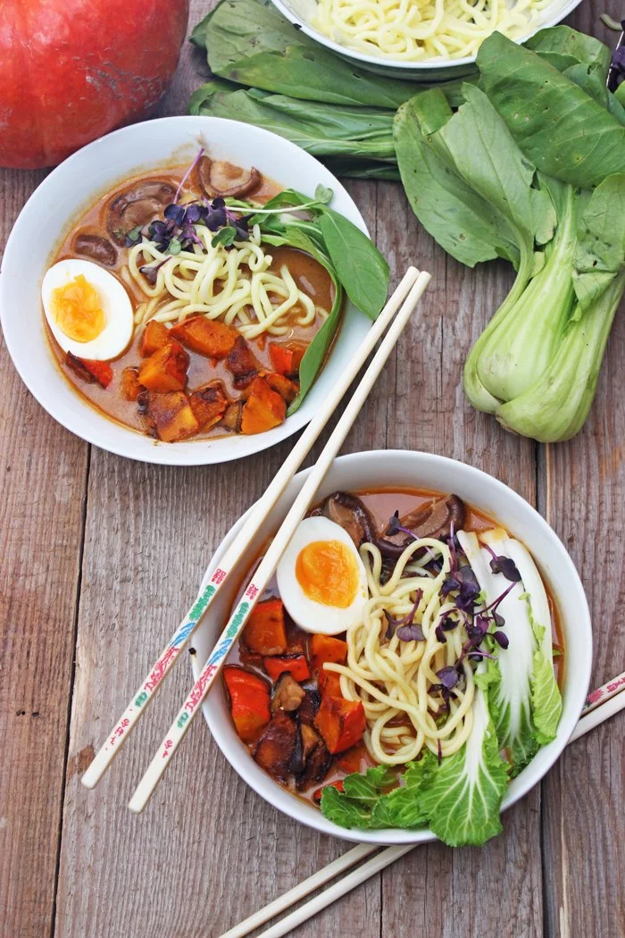 Lass dich nicht durch die erschreckende Zutatenliste dieses Rezepts abschrecken – es ist eine Menge Arbeit, aber Du wirst mit einer Schüssel Ramen Soup belohnt, die so reichhaltig und zufriedenstellend ist, dass du niemals vermuten würdest, dass es vegan ist. Diese Ramen Soup besteht aus einem Topping aus, gebratenem Hokkaidokürbis, Baby-Pak-Choi und frischen Shiitakepilze. Die Brühe selbst besteht aus zwei Brühen. Zu einem eine Veggie Basisbrühe, die aus Suppengrün, Ingwer, Knblauch, Kombu und Wasser besteht. Diese muss Veggie Basisbrühe muss alleine schon 1 3/4 Stunde kochen. Dann benötigt man noch eine Würzbrühe, die sehr schnell und einfach gemacht ist.