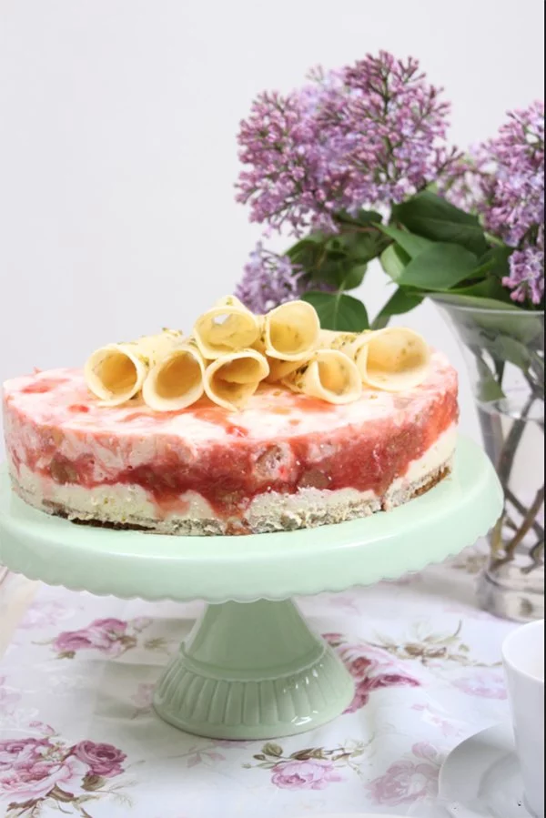 Rhabarber-Topfenmousse-Torte mit Hippenröllchen – himmlisch leicht und locker