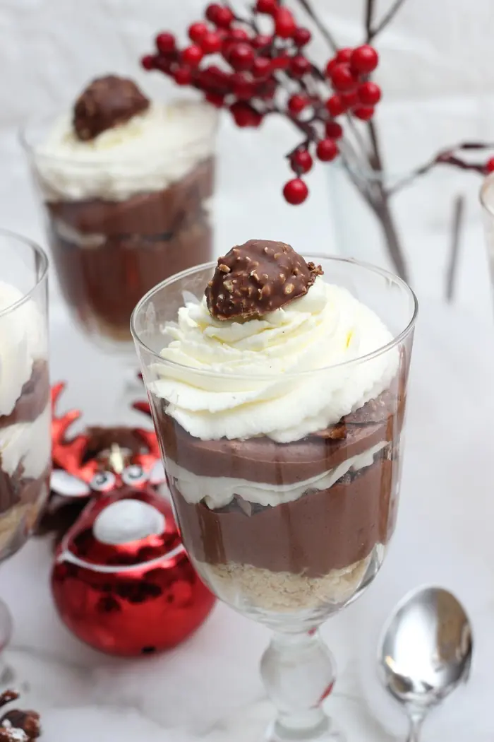 - In einem Dessertglas 1 Esslöffel zerbröselte Butterspekulatius hineingeben. Dann 1 Esslöffel Mousse au Chocolat. Darauf 1 kleingeschnitten Rocher. Jetzt 1 Esslöffel Sahne daraufgeben. Nun wird das ganze nochmals wiederholt und zum Schluss gibt man auf die Sahne eine halbe Kugel Rocher.