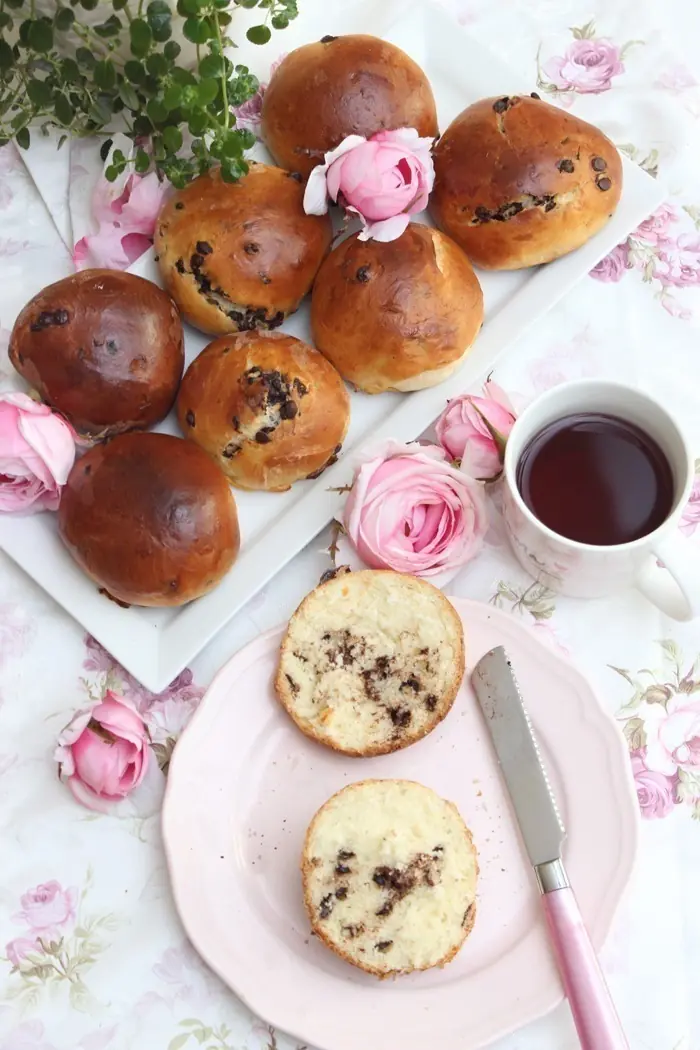 Die Butter und der Soja-Joghurt machen den Teig besonders zart und buttrig, ohne dass dabei eine Schwere entsteht. Insgesamt dürften die Brötchen süß, schokoladig und leicht buttrig schmecken, mit einer sanften Vanille- und Schokoladenaroma-Kombination. Am besten schmecken sie warm, wenn die Schokolade noch leicht geschmolzen ist.