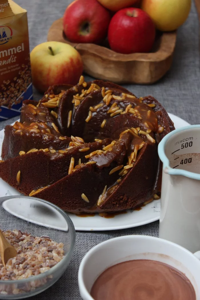 Nun den Schokoladen-Apfelkuchen aus dem Backofen nehmend auf einem Kuchengitter auskühlen lassen. Kuchen erst kurz vor dem Servieren mit dem Mandel-Karamell beträufeln.