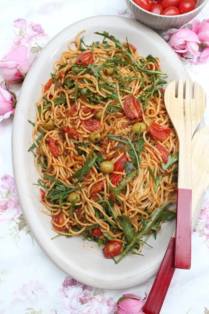 Wie wäre es mit einem Spaghetti-Salat mit Tomaten, Oliven und Rucola, als Beilage zum Beispiel beim nächsten Grillen? Köstliche Aromen vereinen diesen Salat. Er schmeckt nicht nur göttlich, sondern ist auch innerhalb von 20 Minuten gemacht.