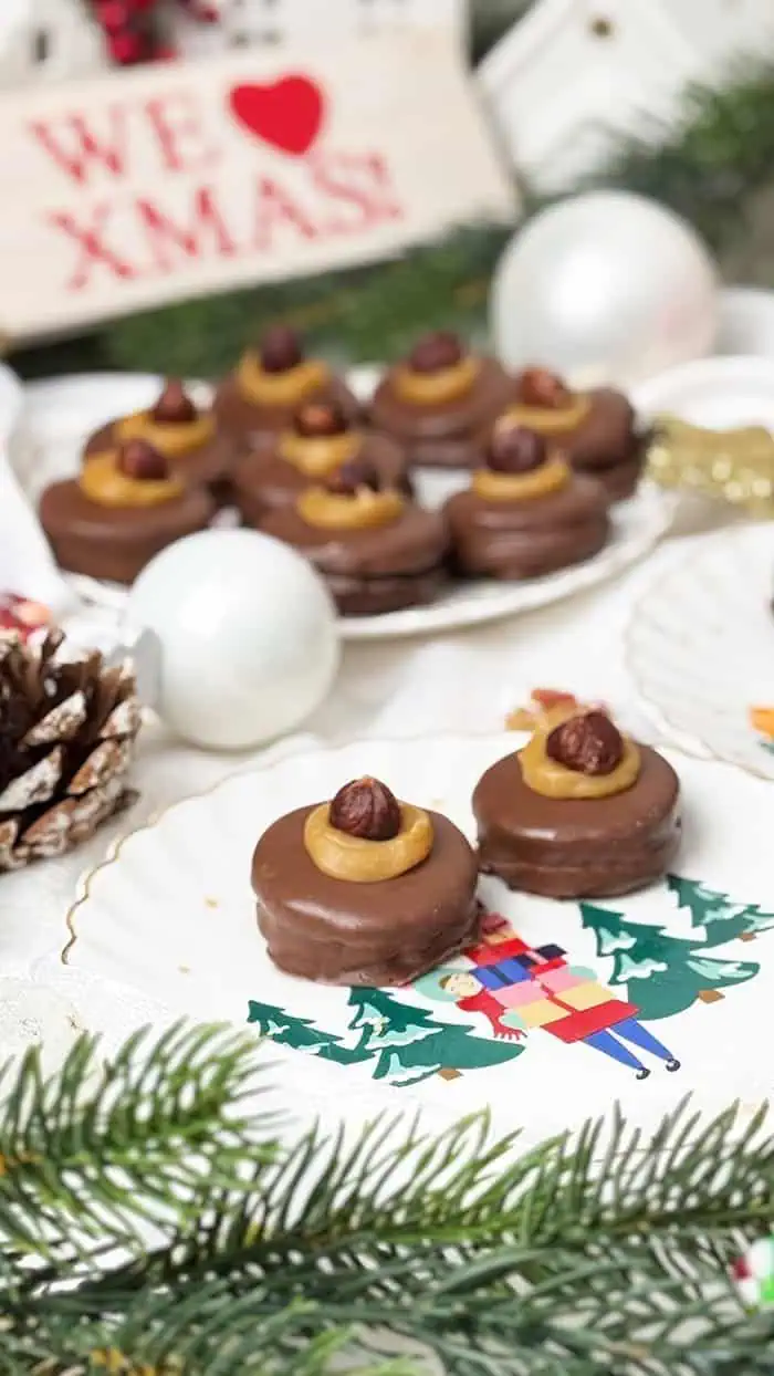Das Zusammensetzen der Plätzchen mit geschmolzenem Nougat war meditativ, und als Krönung gab ich jedem Plätzchen eine glänzende Schicht Kuvertüre. Der Toffee-Tupfen obendrauf und die Haselnuss gaben den Plätzchen ihren unverwechselbaren Charakter, so elegant und zugleich verspielt. Der Aufwand dieser leckeren Plätzchen war es wert.