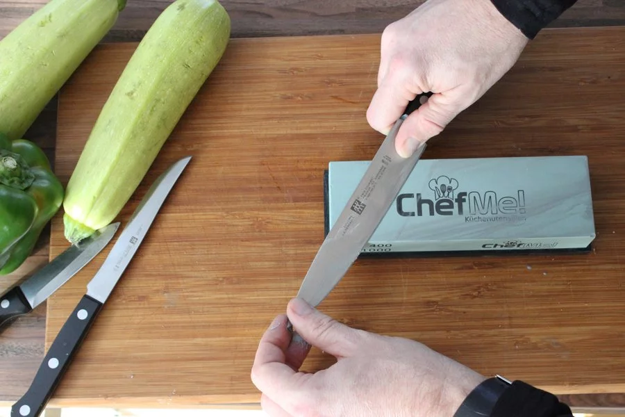 Messer sind in der Küche unverzichtbar. Kaum ein Gericht lässt sich ohne sie herstellen. Mit Messern wird geschnippelt und gehackt, oder auch filetiert und gesägt. Doch dafür müssen sie scharf sein. Doch wie bekommt man ein stumpfes Messer, das seit Jahren nicht mehr richtig schneidet, wieder scharf ohne gleich ein neues zu kaufen … Mit einem Schleifstein.